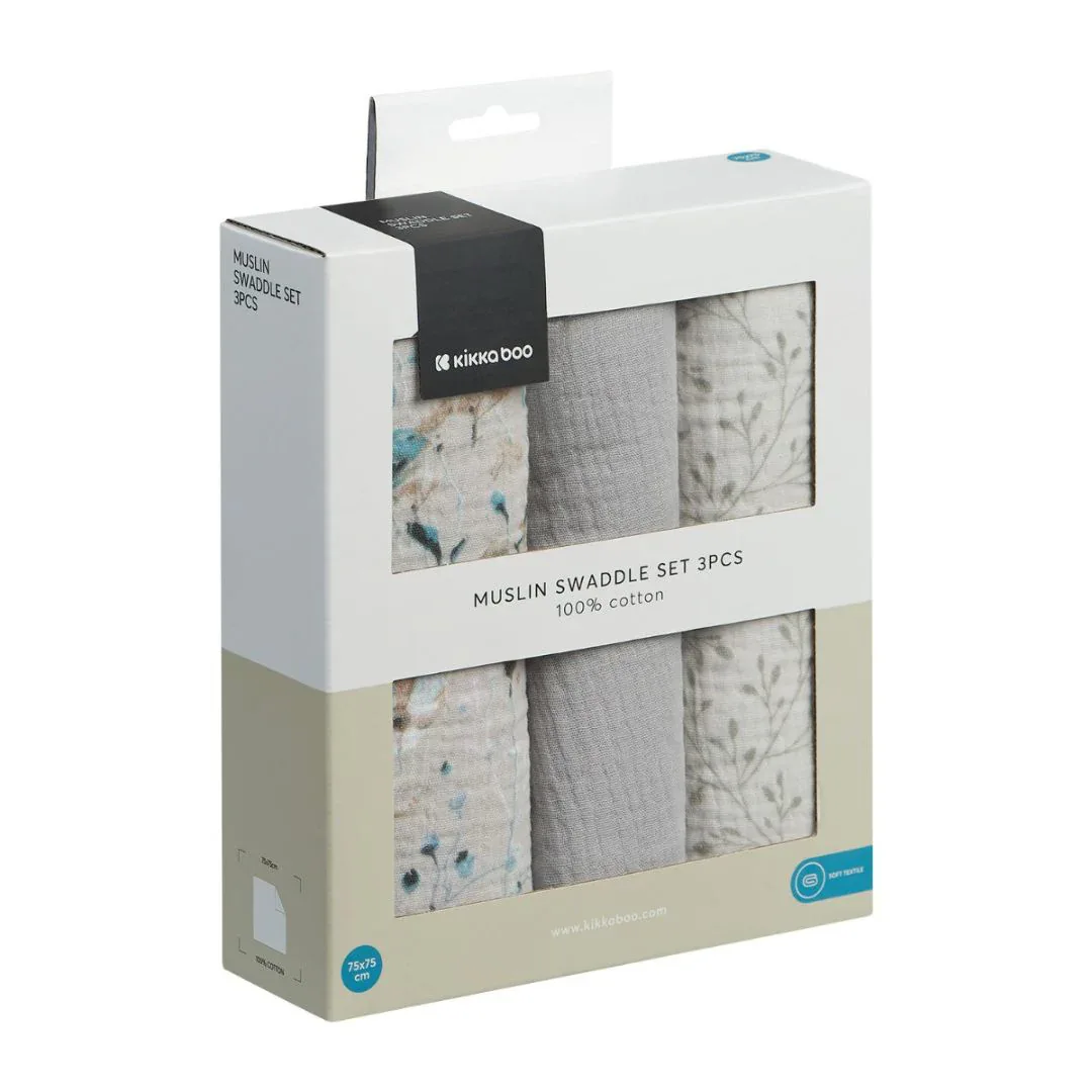 KikkaBoo® Muslin swaddle set 3 pcs 100x100 cm Dreamy Fields Grey